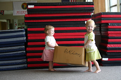 Here's a photo of K doing teamwork with her best friend Fiona at our breastfeeding support group. They found this box in one of the closets and carried it all over the room together. A couple of times they took turns riding in the box while the other one pushed it.