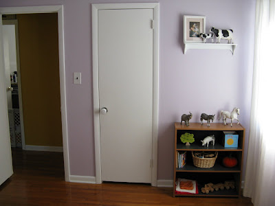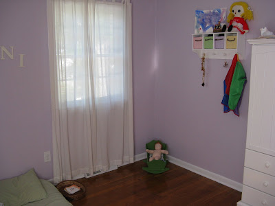 K has night weaned and has decided she wants to sleep in her room now. So I had to take all my stuff out of it, I was using her room as my craft/storage room. It still needs some work but is pretty much done. She spent her 1st night up there last night. Daddy sleeps with her until she wants him outta there <3 We are saving to buy her an organic mattress and bed frame but that will be a few months,they aren't cheap!!