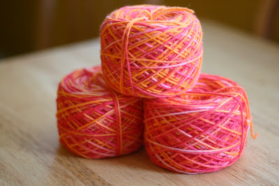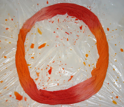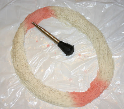 Starting with your lightest color (which for me was pink lemonade) take your turkey baster and squeeze some of the dye onto the yarn in whatever pattern you like. I tend to stick to the simple ratios, almost like cutting the circle like it was a cake.