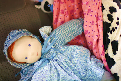 except the bag. I ran out of time and patience so this is a temporary bag for K to use on the road trip and then once we are settled in Portland I will make her a new one. I just couldn't see making her wait even longer for this just because of my dislike of the bag.