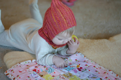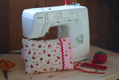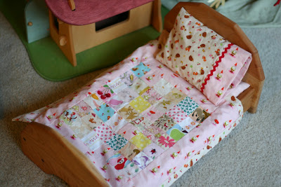doll beds for Christmas. I knew the girls would love having a special place for their favorite dolls to sleep at night, so I was excited for them to get these beds. Then I had the idea that I should make bedding for the beds (to make it look nicer and more personalized for the girls, and to prevent the wool mattress and pillow from getting dirty). That's fast and easy sewing, no issues there, but then I decided since K has a beautiful doll quilt (made by Ram in the Thicket) for her doll, C needs one, too. I have wanted to try my hand at quilting for a long time so what better time to make one, right? I grew up sewing, conquered and loved industrial sewing machines, majored in fashion design...but yet I have always been afraid of quilting. There just seems to be no margin for errors in quilting, and my usual sewing style of not following rules and patterns exactly doesn't seem to mesh with that. In an effort to work through my fears I found a simple quilt pattern in an old issue of Living Crafts and decided I would try it. I found the perfect fabrics for it. Of course they were out of print/hard to find fabrics so I literally had a piece of fabric from a cut up pair of pajamas (the gnome print) and the last yard available pretty much anywhere of some cute hedgehog, squirrels and toadstools.