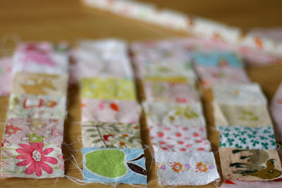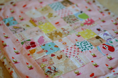 Fast forward to the presentI have been putting this project off for months and finally last night I made myself start on it. The first thing I did was cut to size my main piece of fabric that is for the back and trim of the quilt. Remember that saying 'measure twice, cut once'? Well, I didn't. I majorly messed up cutting that piece of fabric and now I don't have enough. It was the last yard, too so there is no buying more. Hanging my head in defeat and munching on peppermint bark for comfort I sewed up a quick pillowcase for C's doll bed just so I could get something accomplished. Then I saw K's doll quilt out of the corner of my eye. Looking it over I thought maybe,