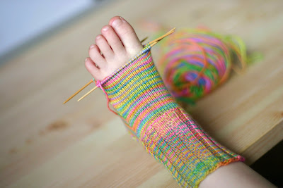 K fell in love with this yarn the last time we stopped into our local yarn shop. She asked me if I would knit her and C some matching rainbow socks. How could I refuse that request? I started on hers and will do C's when I am finished. I found a