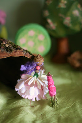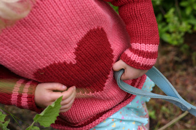 something, something. K loves embroidery so I thought I would embroider a couple of flowers and a simple word to finish it off. I sewed some pink ties to the back of it (one for each handle bar and one in the middle of the bag to tie around the front part of her bike), and it was done. I surprised K on our next nature walk with it, and she really put it to the test.