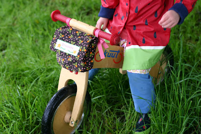 When we take longer nature walks, or when we are trying to wear out the dogs, K rides her skuut bike along side us. She loves riding it and from the way she rides it, I think she'll be on a traditional bike by next summer (we chose to have her learn to ride on a balance bike instead of a traditional bike with training wheels, to avoid training wheels all together). The only problem she has with riding her bike is that she has no place to put all of her nature treasures. She tries to carry them in her hands while riding but she always finds so much more than she could possibly hold on to. I promised her I would figure something out. I really wanted to get her a basket to put on the front of her bike but a.) I didn't know if a basket would fit on her bike and b.) money is always an issue. So that idea was scrapped. Then I happened to look over at my scrap fabric pile and thought