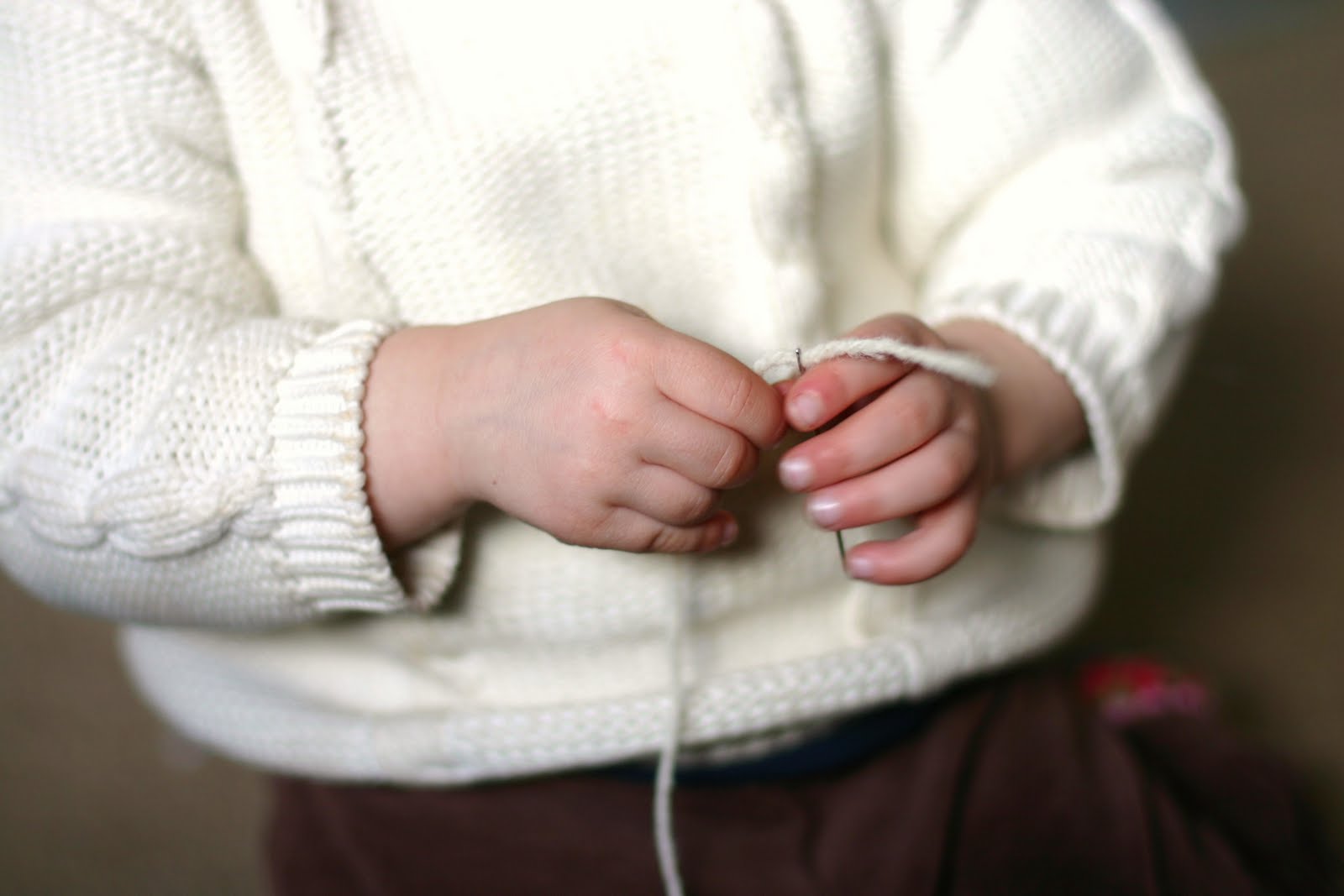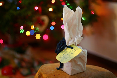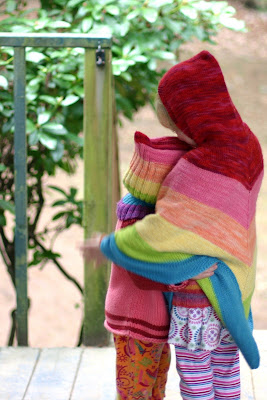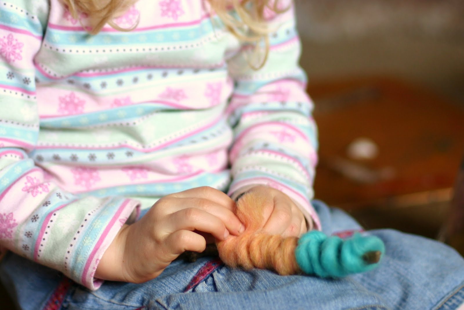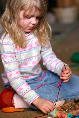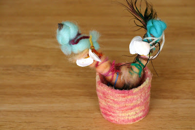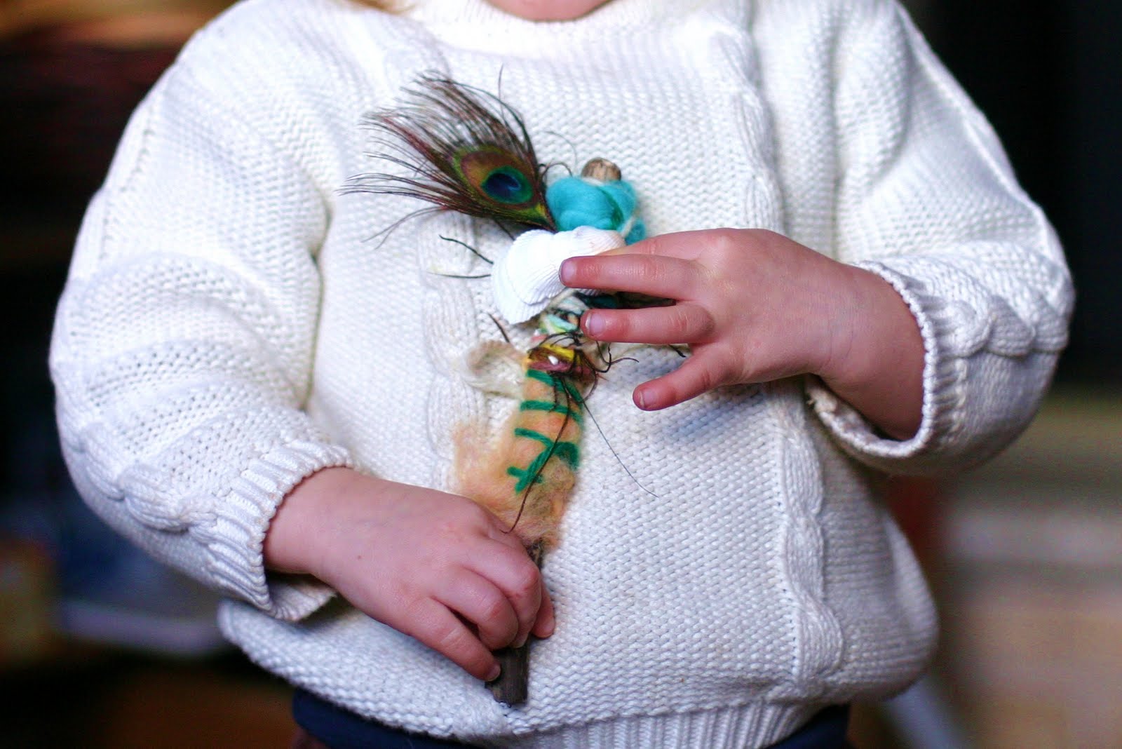 The first time I told the story both of my girls seemed to hang on to every word. It's about a little girl who finds a stick in her garden. It sings to her, 'Wrap me up in colors bright; keep me safe both day and night - And when there's magic in the air, I'll lead you to a treasure fair!'. She decides it is a magic stick and brings it inside with her. She wraps it up in her mother's wool roving and keeps it in a special place on her nightstand. It would wake her up in the morning singing, 'Today there's magic in the air, I'll lead you to a treasure fair!' and she would follow wherever it led her. The first morning it lead her to bird feathers in the garden and she decorated it with them. The next morning it lead her to shells on the beach and she again adorned it with them and then lastly it lead her to her parents' room where she found her new tiny baby sleeping between them. She thought 'this is indeed a treasure fair' and held up her magic stick for the little baby to see. The magic stick continued to bring her to many treasures fair but finding a new baby in her parents' bed was her most favorite treasure fair of all.
