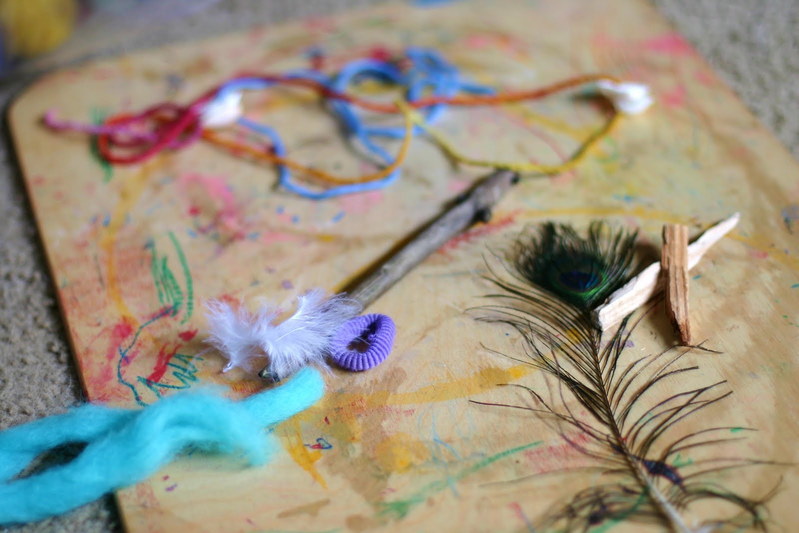 We brought them home and pulled out some of my wool roving stash, some seashells we collected last year at the coast, and 2 very special peacock feathers that I gathered years ago while living at an ashram.