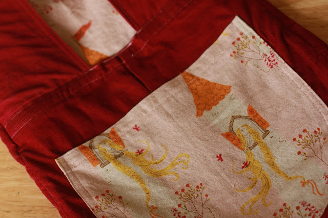 The pattern was easy to follow. I had lots of fun picking out the fabric for it. I ended up using some Rapunzel fabric I had in my stash (a dress for K is in the works out of the rest of it). The light pink of that fabric paired with the burgundy of the corduroy reminds me of babushka dolls.