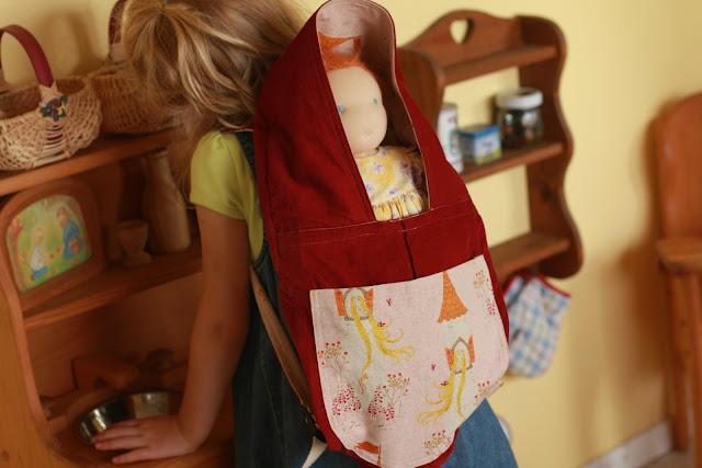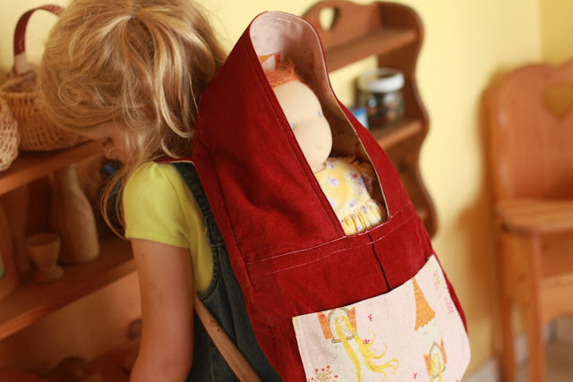 The pattern is from Growing Up Sew Liberated. I knew as soon as I received the book that I would be making these for my girls. You see, for as long as I can remember K has had a love of babies in papooses. Her love of them has been passed on to C, as well. C calls them papoosas, and both her and K are always asking us to wrap them up and carry them around like papoosas. It's oh so sweet! We have a couple of wooden figures of Mamas with their papooses that the girls obsess over, but the idea of a papoose of their very own to carry their special baby dolls in - OH MY! I secretly love the idea of the doll being pretty covered in it, too, so that it will hopefully stay clean easier.