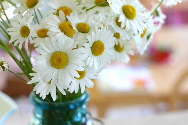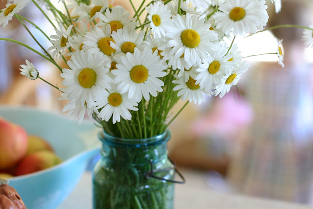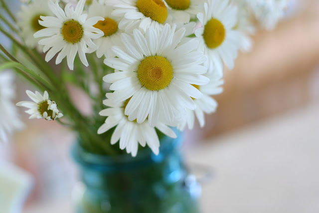 Ah, I step into my kitchen at just the right time of day to see father sun shining ever so beautifully through an old vintage canning jar of mine. Love those jars, by the way, I am always hunting for them. I had a thrift store score last week finding one for 95 cents. The way the sun made the aqua colored glass glow along with the bright yellow of the wildflowers - it was just a photographic moment I could not pass up. I had to run off and find my camera. Sometimes that's an easy task and other times not so much. I tend to leave my camera all over the house - depending on where I took a photo last. Luckily, this day I knew right where it was. I grabbed it and ran back to the flowers.