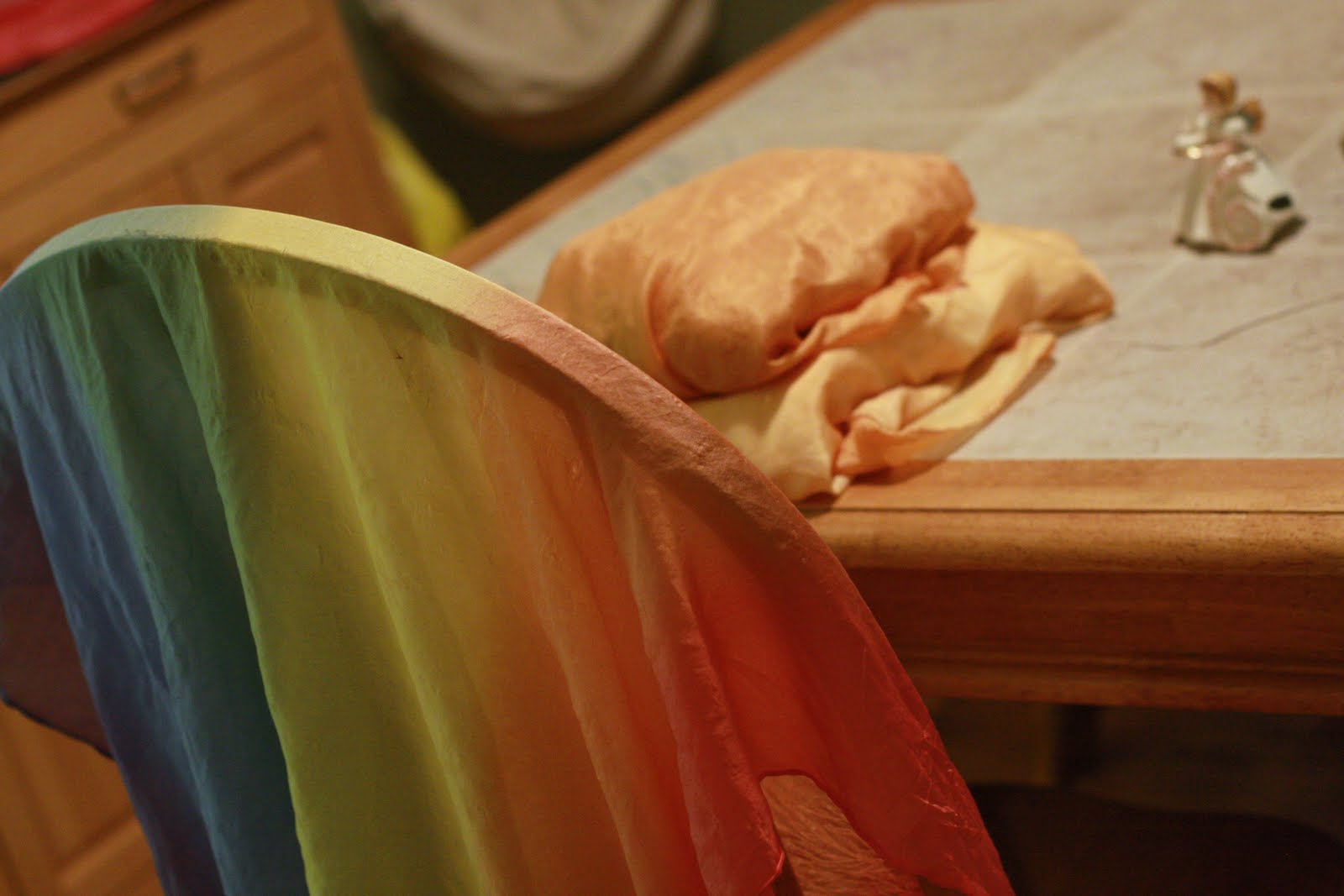 When the child wakes she will (usually) put on her crown and follow her birthday trail into the dining room. There her chair is decorated with a rainbow cloth and her birthday dress and sweater are wrapped in cloth and waiting for her on the table in front of her chair. She opens these first thing in the morning. The rest of the gifts are opened sometime that day. We don't really have a set time for that.