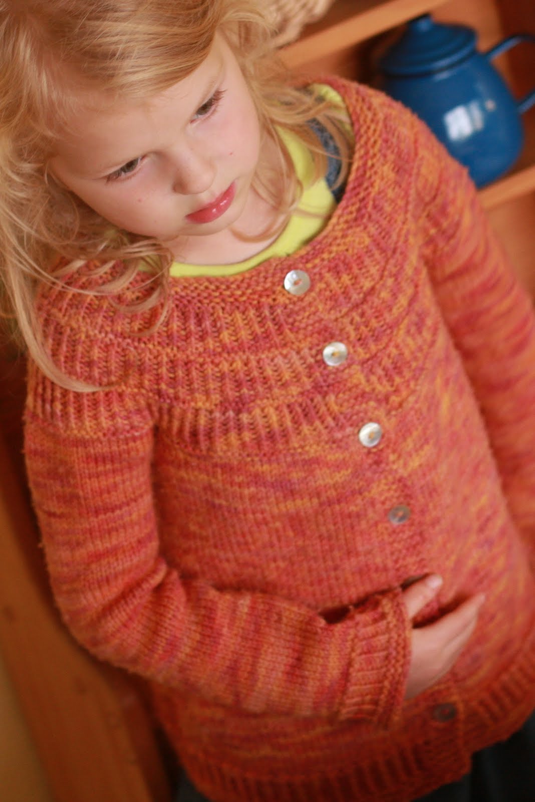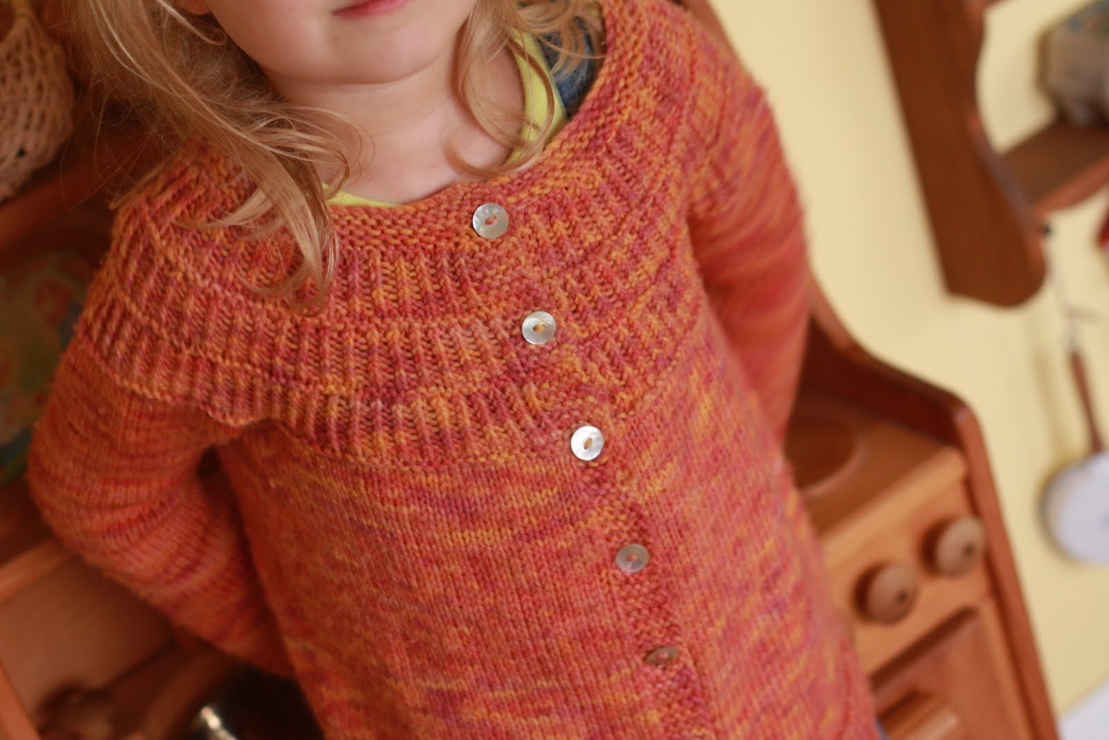 You may have figured it out by now but I made K a mini shalom cardigan like mine. She was really excited that we have the same sweater, even if it's with different yarn. I hit quite a few snags modifying this adult vest pattern into a child sized cardigan but I think I pulled it off ok. I have detailed notes on all the modifications here. After all of my debating and fussing over that yarn - she loves it. The colorway actually looks quite autumny to me, now that I am seeing it all knit up. She has literally worn it every single day since her birthday. That just makes my heart melt.