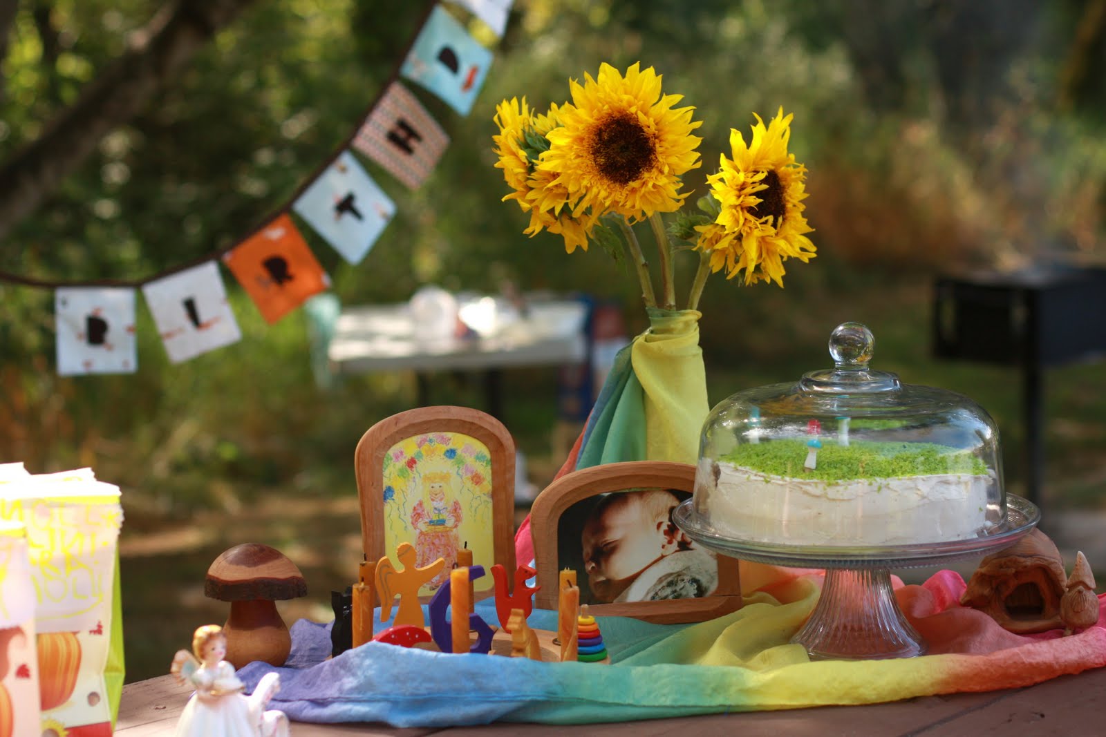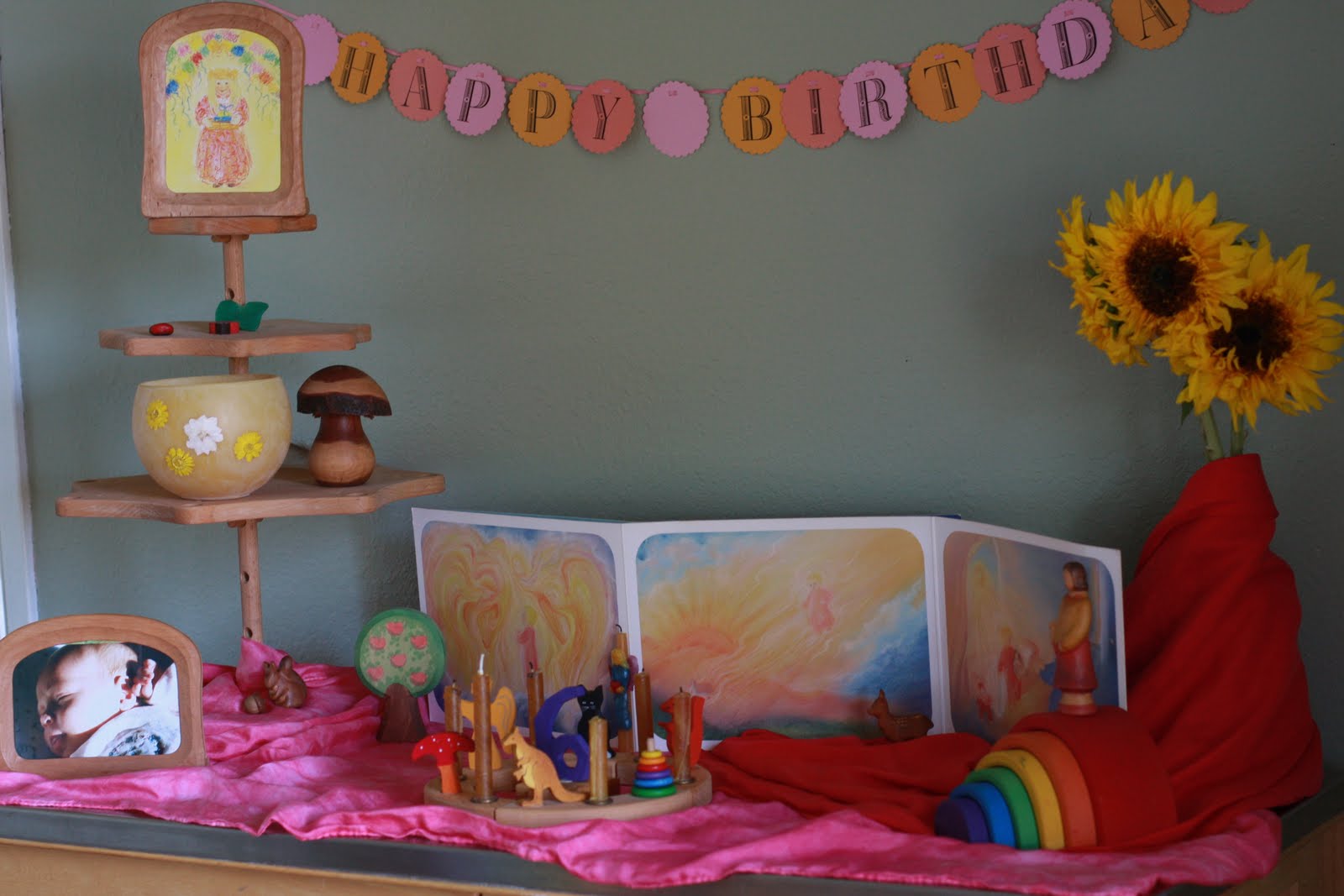 I hang up our cloth birthday banner somewhere in the house and set up their birthday ring and table. Since we moved into this house we have used our dining room nature table as the birthday table. We transform it to depict the season in which the child was born, as well as show the rainbow bridge story. It also holds their birthday ring, a picture of the birthday child as a baby, cards and gifts from extended family members and friends as well as the birthday cake.