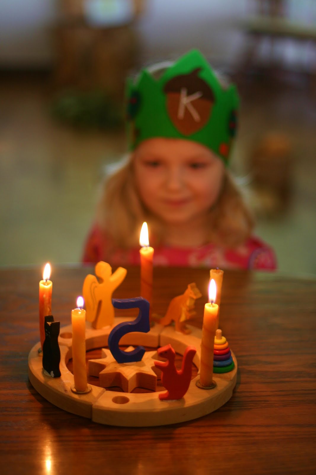 At some point during the day we tell the child's rainbow bridge story. This is when we light the birthday ring candles. When the story is through we tell little tales of things the birthday child did each year of their life. So we would say: When K was one she took her first steps, then we would light the first candle on the ring. When K was two she... then light the second candle and so on and so on.