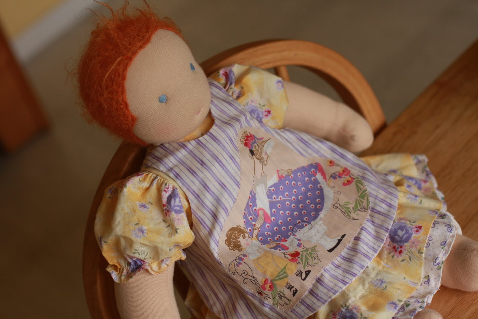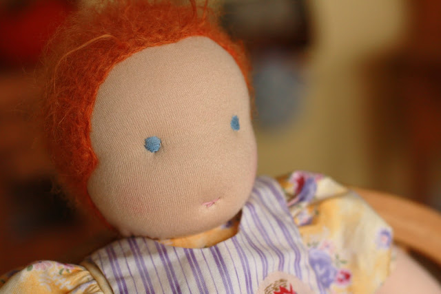I typed up my Birthday Makings post last night in bits and pieces in between (still sick) Baby L's constant wakings to nurse so I forgot a couple of details. One of the more important one being what pattern K baby was made from. She is the Joy's Waldorf Dolls 16" baby companion. I chose to leave off the nose, though. It seems that every doll I make or buy that has a nose ends up getting ridiculously dirty on the nose or the fabric wears off there. I decided to forgo it altogether.