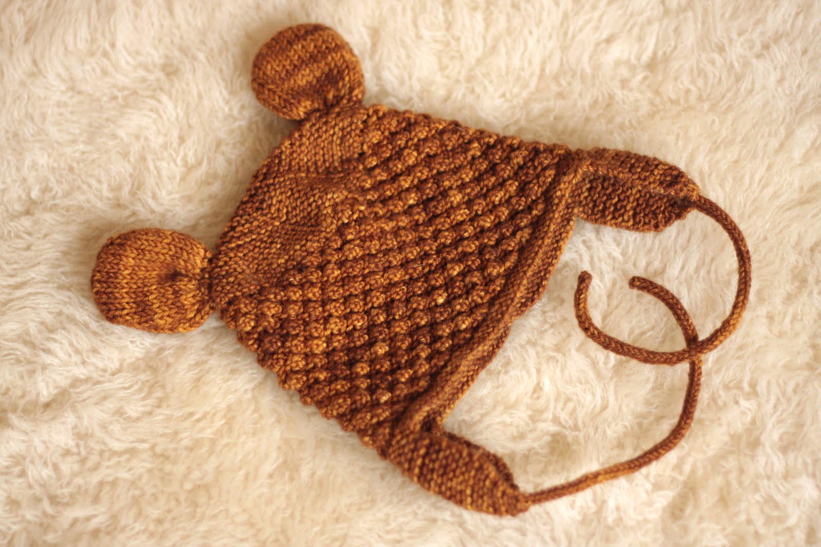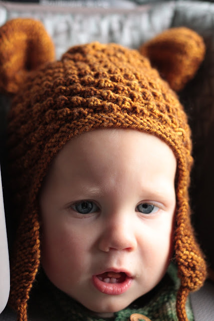 this new hat from me simply because I was looking for an excuse to knit this cute pattern up. I had to modify it a bit to make it a larger size but I think I managed to get it to work out. He makes an adorable little bear if I do say so myself! That silly picture of him wearing it in his car seat is the only one I have right now due to aforementioned dark and gloomy skies.