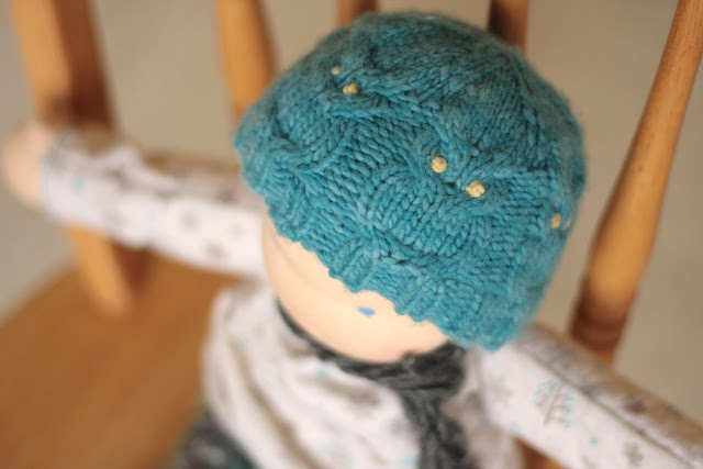 the hat I knit for him when he was first born. It was too small on him but fits his baby doll just right.