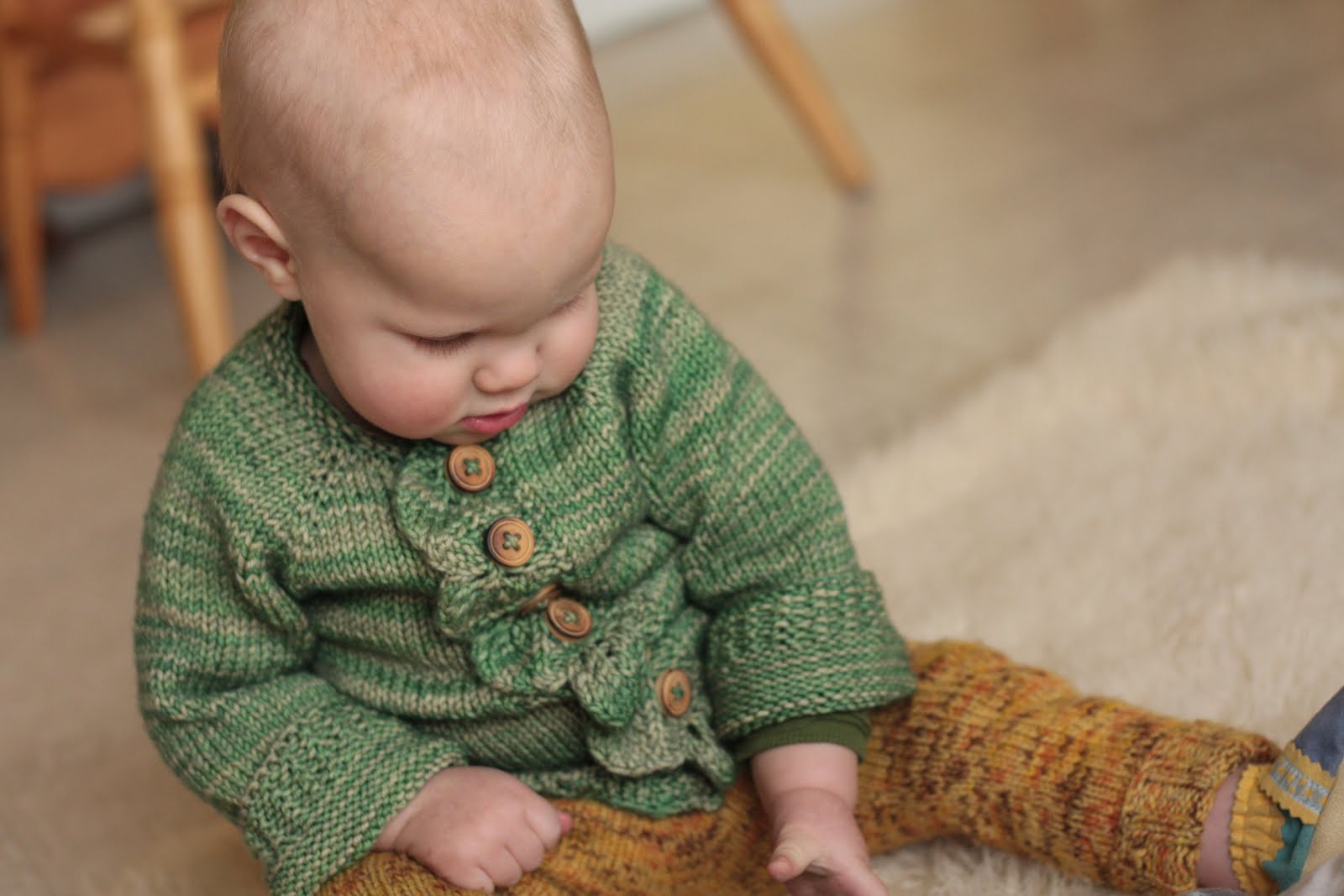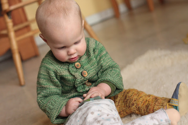 Sweet Basil yarn in the lemon grass colorway that I have been hoarding forever. It looks so darn cute on him, the color is just perfect.
